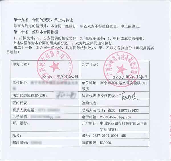 热烈祝贺广西顶博电力设备制造有限公司与广西桂垦金茂牧业有限公司于2020年11月24日成功签订7台