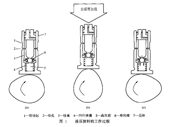 随着凸轮的继续转动,挺杆壳体上的压力降低,这是因为凸轮的凸部已经转过挺杆。随着油压的降低,气门在气门弹簧的压力作用下关闭,挺杆的柱塞和壳体也回到初始的位置。机构中的所有间隙再次被油压消除。当挺杆到达图1(c)所示的位置时,就已准备好重复以上工作循环。