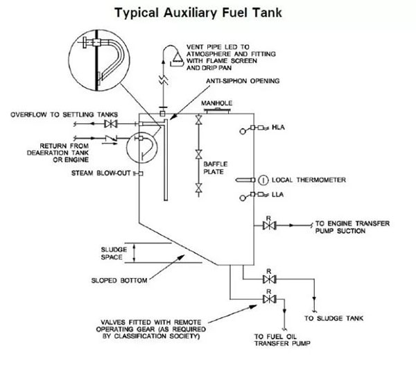 一般情况下室外油罐采用埋地式,依靠日用油箱与室外油罐之间的高差,可实现重力回油。