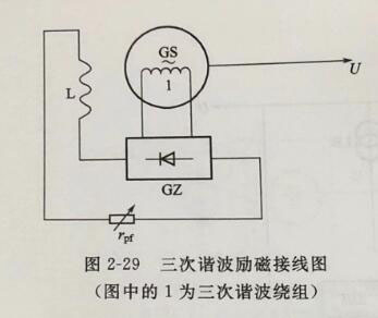除了他励和自励两类主要的半导体励磁方式外,还有一种介乎两者之间的所谓谐波励磁系统。在主发电机定子槽中嵌有单独的附加绕组,称为谐波绕组。利用发电机气隙磁场中的谐波分量,通常是利用三次谐波分量,在附加绕组中感应揩波电势作为励磁装置的电源,经半导体整流后供给发电机励磁。如图2-29所示。谐波励磁方式有一个重要的有益的特性,即谐波绕组电势随发电机负载变动而改变。