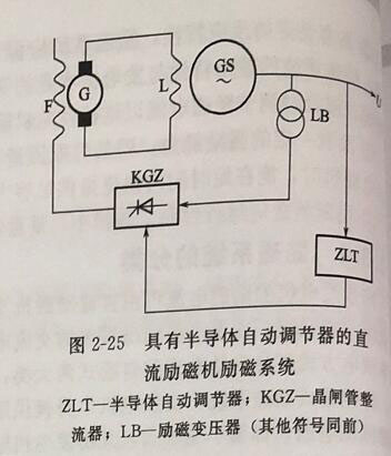 如图2-25所示为具有半导体自动调节器的直流励磁机励磁系统。自动工作时,同步发电机的励磁电流由自动调节器按同步发电机运行情况自动调节,调节信号由同步发电机的输出端取得。过去在直流励磁机的励磁回路中串入碳阻式调节器代替手调电阻,现在已被晶闸管半导体自动调节器所代替。