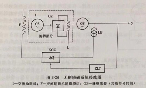 上述③、④两种方式,硅整流元件和交流励磁机电枢与主轴一同旋转,直接给主机转子励磁绕组供励磁电流,不但取消了直流励磁机系统中的换向器-电刷结构,而且取消了与朝步发电机励磁绕组相连的集电环-电刷结构,故称为无刷励磁(又称无触点励磁或旋转半导体励磁)方式。交流励磁机的励磁绕组固定不动,其接线如图2-26所示。有的发电机在定子上设置一个没有励磁绕组的磁极,它是用优质的永磁材料制成,作为初始磁场起励建压。